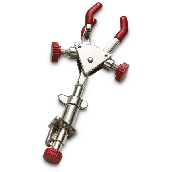 Pinza doble para buretas, asegura sujeción firme y estable en montajes de laboratorio.
