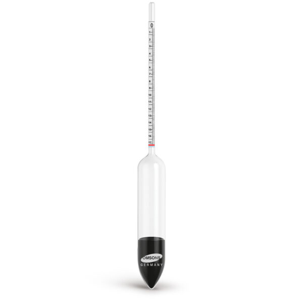 El alcoholímetro de vidrio es un instrumento de medición simple y confiable diseñado para determinar el porcentaje volumétrico de alcohol etílico en soluciones hidroalcohólicas. Fabricado en vidrio borosilicato, ofrece resistencia térmica y química, y permite lecturas precisas gracias a su escala impresa clara en % v/v. Es ampliamente utilizado en destilerías, bodegas, laboratorios de control de calidad y producción de bebidas alcohólicas, como vino, cerveza, tequila, aguardiente y licores. Funciona por flotación: al sumergirse en el líquido, flota a una altura proporcional a la densidad de la mezcla, permitiendo una lectura directa sin necesidad de electricidad. Es reutilizable, fácil de limpiar y se entrega en estuche protector individual.