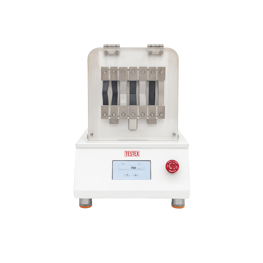 El DeMattia Flexing Tester TF117A de TESTEX es un instrumento de laboratorio que simula condiciones de flexión repetida para determinar la resistencia de materiales como caucho, cuero y tejidos recubiertos a la formación y propagación de grietas. El equipo sujeta las muestras entre mordazas y las flexiona constantemente, permitiendo observar el grado de agrietamiento y comparar la resistencia a la fatiga por flexión. Cumple con las normas EN ISO 7854 Método A, ISO 7854 Método A y GB/T 12586 Método A.