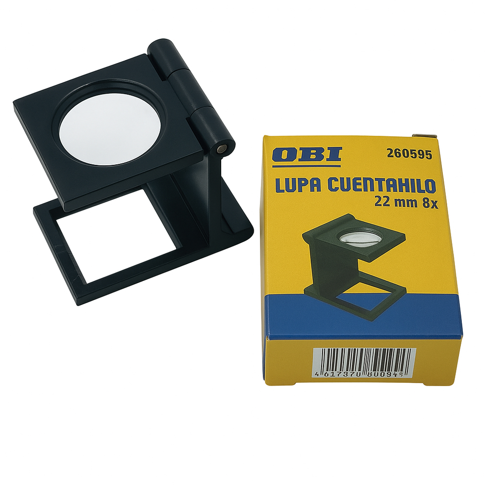 Lupa cuentahilos OBI con lente óptica de 22 mm y aumento de 8X, diseñada para inspección detallada de superficies. Su cuerpo metálico plegable garantiza resistencia y portabilidad. Adecuada para uso en impresión, textil, numismática, electrónica y control de calidad. Compacta y ligera, incluye estuche para transporte y almacenamiento seguro.