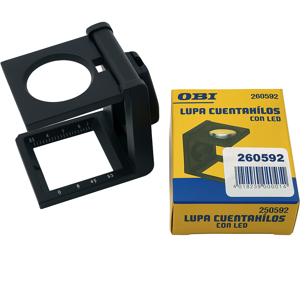 Lupa cuentahilos OBI con lente óptica de 25 mm y aumento de 5X, equipada con iluminación LED integrada para mejorar la visibilidad en condiciones de poca luz. Su estructura plegable ofrece portabilidad y resistencia. Ideal para inspección detallada en impresión, textil, numismática, electrónica y control de calidad. Incluye estuche protector.