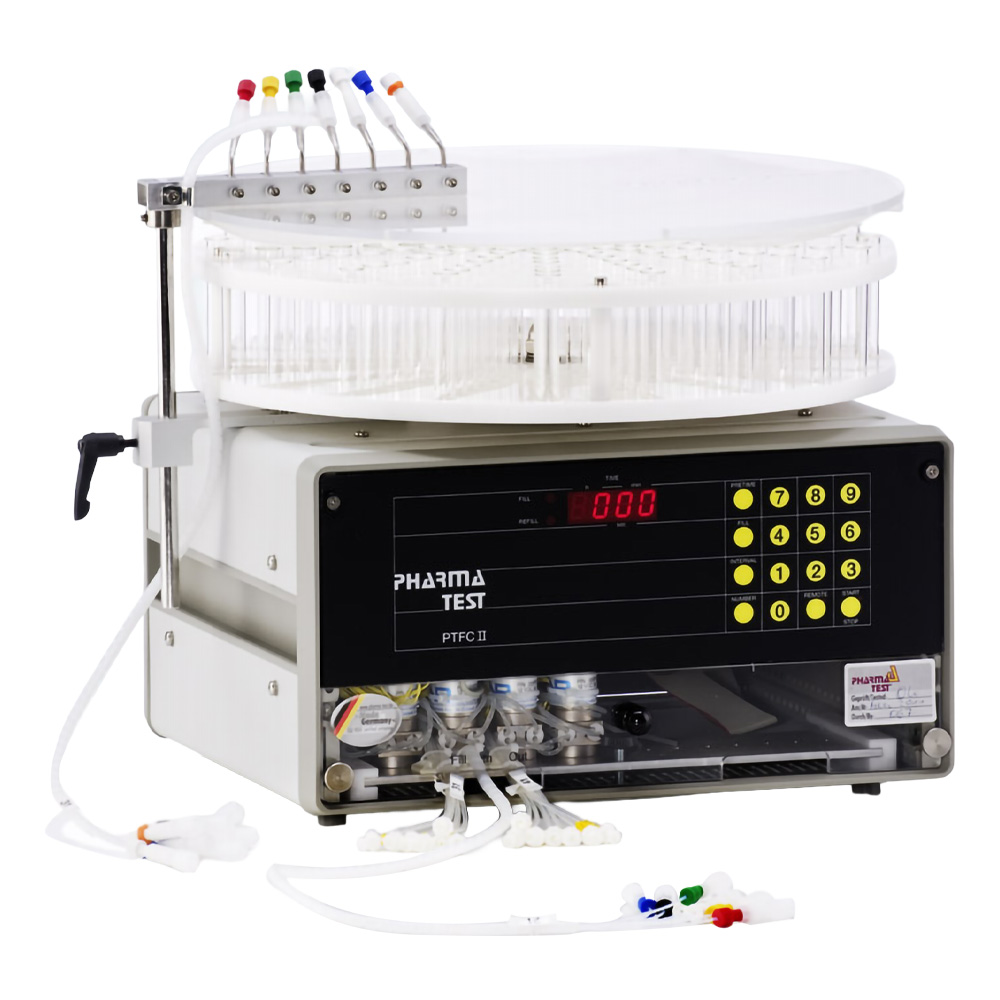 El DFC-120SP es un sistema de prueba de disolución semi-automatizado que consta de un baño de disolución PTWS 120D de 6 posiciones con centrado individual de vasos, instalación completa de tuberías en PTFE con sondas de muestreo in situ, una bomba de jeringa PT-SP8 y un colector de fracciones PTFC-2/8. Este sistema permite el muestreo automático a intervalos preprogramados sin necesidad de software externo.