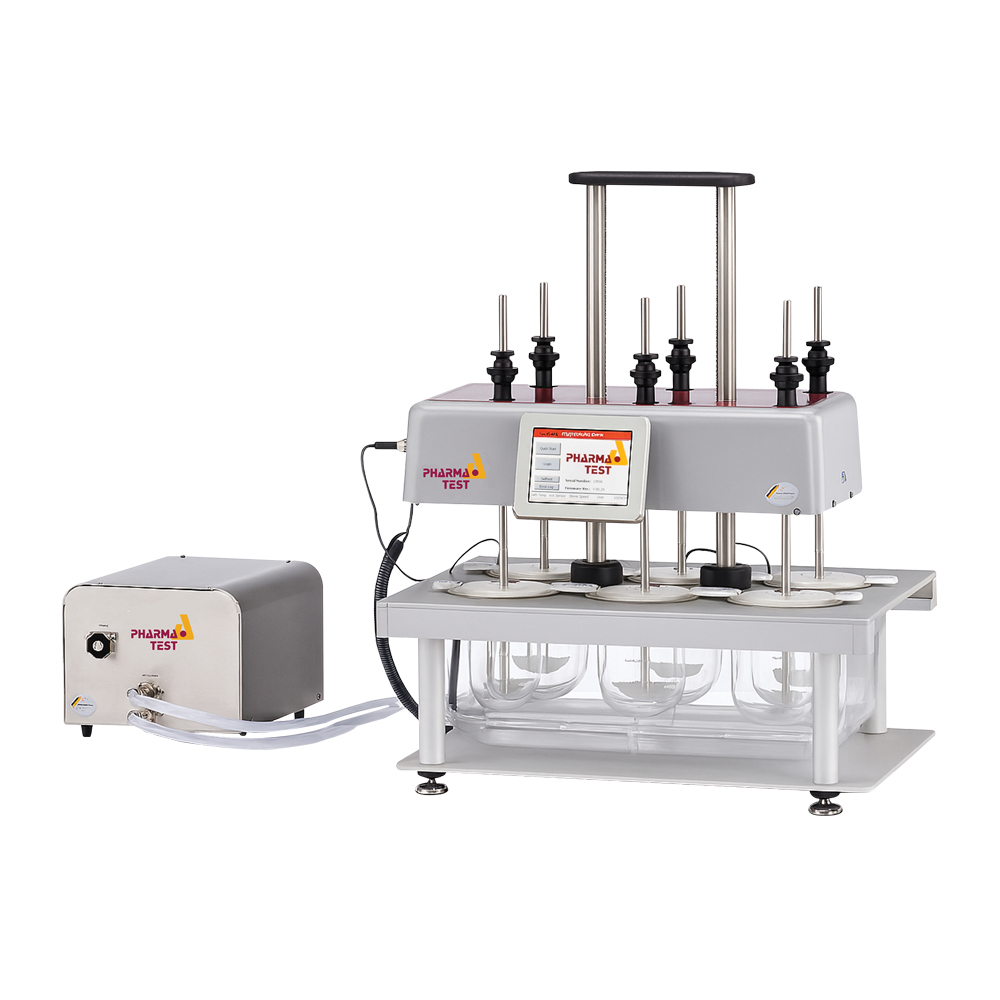 Sistema de prueba de disolución semi-automatizado con baño de 6 posiciones, que incluye bomba de jeringa PT-SP8 y colector de fracciones PTFC-2/8.