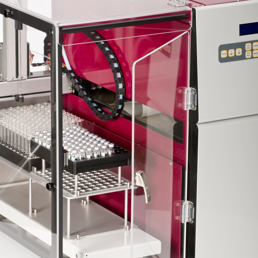 Colocar viales abiertos o viales HPLC con septa en los racks del DSR-M según el tipo de muestreo y procesamiento requerido.