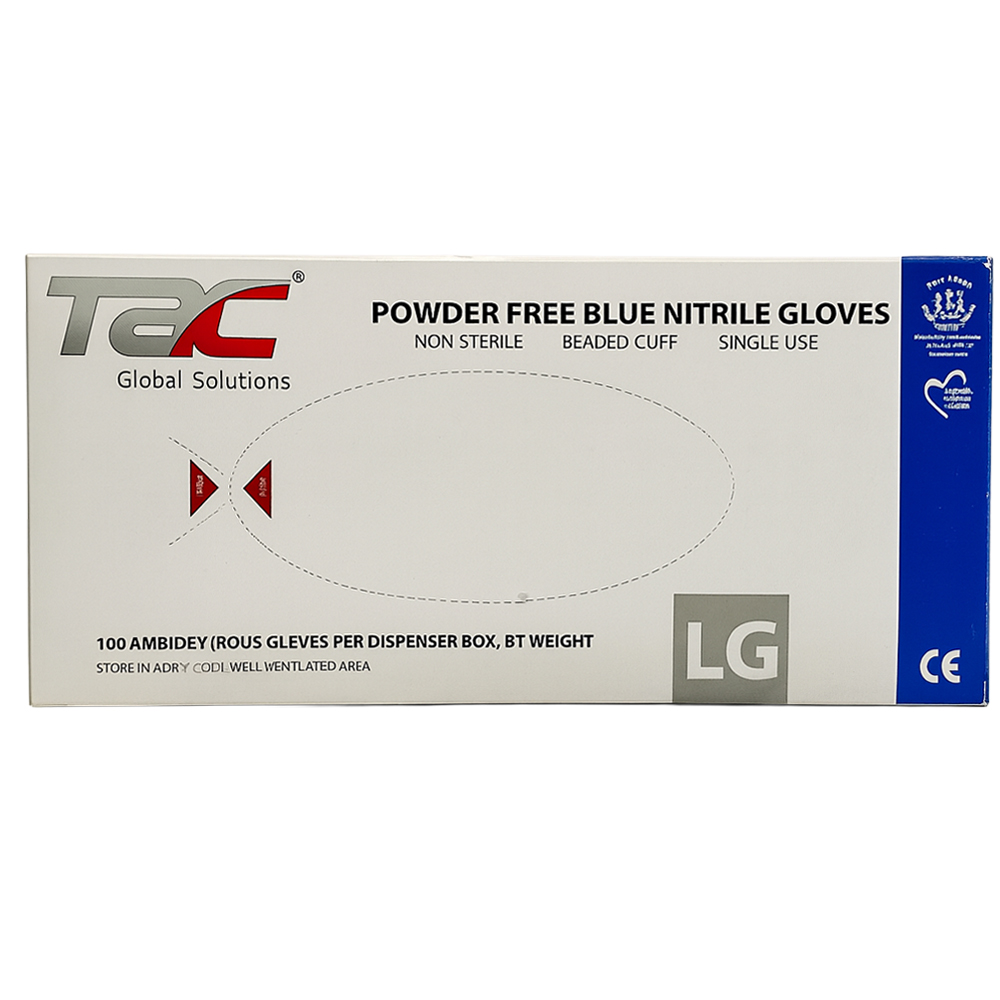 Los guantes de nitrilo TAC Global Solutions ofrecen alta resistencia química y mecánica. Son libres de polvo, no estériles y de un solo uso. Color azul, talla L, ambidiestros y con puño enrollado para mayor seguridad. Presentación en caja de 100 piezas, ideales para laboratorio, industria y salud.