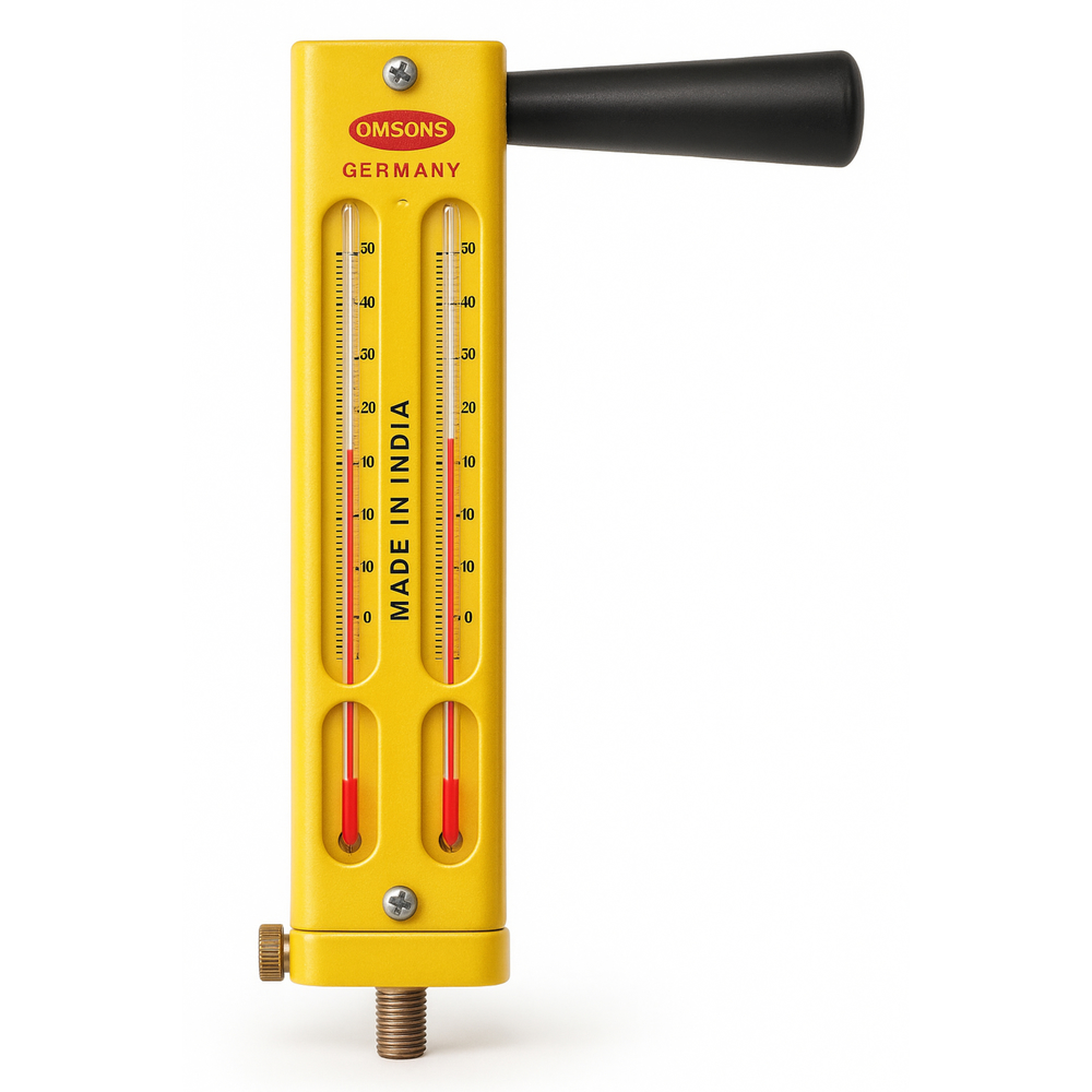 El higrómetro giratorio, también conocido como whirling hygrometer, permite medir la humedad relativa del aire mediante el principio psicrométrico. Este instrumento cuenta con dos termómetros montados en una estructura giratoria manual: uno con bulbo seco y otro con bulbo húmedo. Al girar el dispositivo, se fuerza la ventilación alrededor de los bulbos, permitiendo una lectura precisa sin necesidad de ventilación eléctrica. Está especialmente diseñado para uso en campo, agricultura, inspecciones ambientales, laboratorios y cámaras climáticas. Fabricado con vidrio borosilicato y estructura plástica o metálica resistente. Incluye tabla psicrométrica para cálculo de humedad. Su portabilidad, autonomía y facilidad de uso lo hacen indispensable para profesionales que requieren mediciones rápidas, confiables y sin conexión eléctrica.