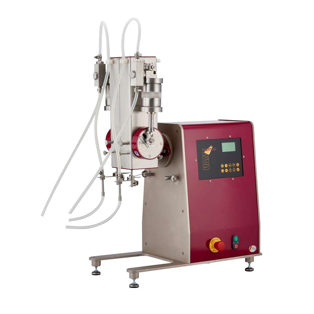 Instrumento de llenado y dosificación de líquidos que utiliza dos bombas de pistón con válvulas de tres vías, permitiendo una dosificación precisa y sin goteo de líquidos de baja viscosidad. Su diseño vertical y compacto facilita el ajuste del volumen de dosificación y permite la fácil extracción de los cilindros para limpieza o intercambio por otros de mayor capacidad.