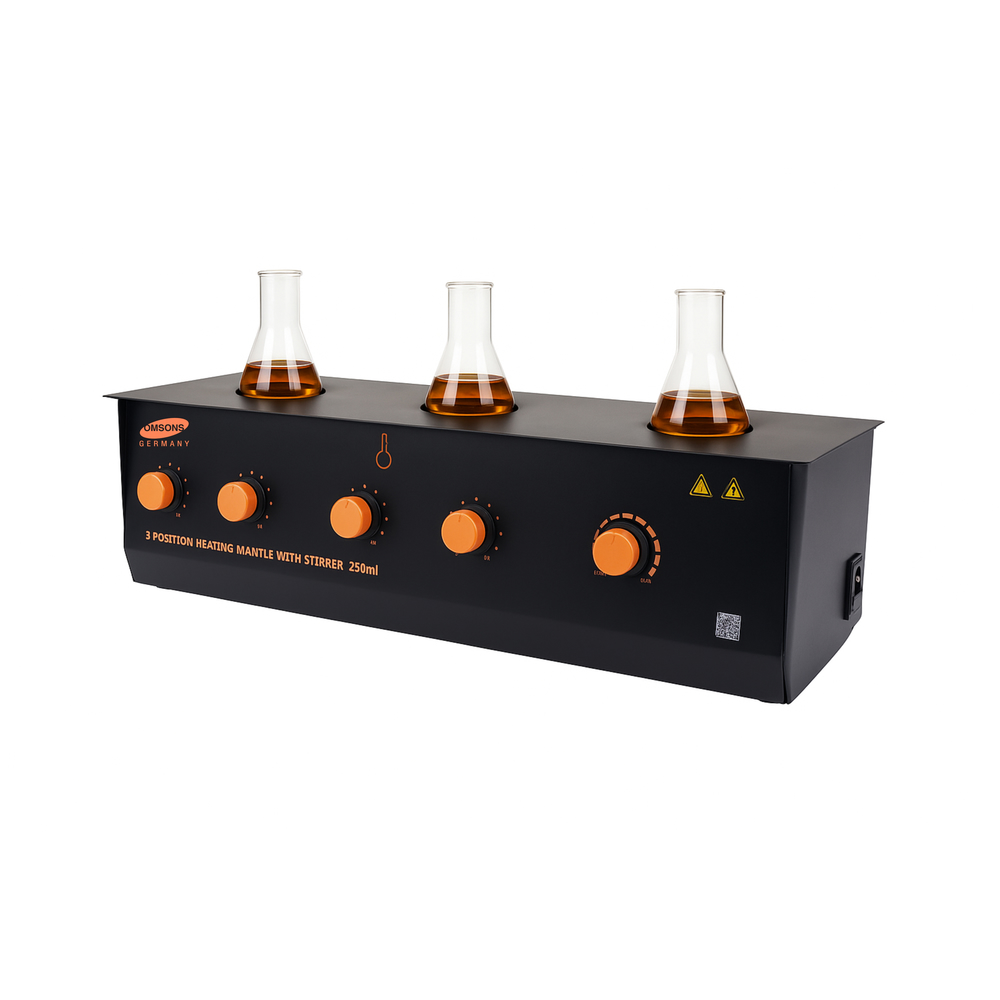 La manta calefactora de 3 estaciones con agitador – analógica está diseñada para calentar y agitar simultáneamente hasta tres matraces redondos, cada uno con controles analógicos independientes de temperatura y agitación. Fabricada con una carcasa exterior metálica con recubrimiento resistente a productos químicos y calor, y una cavidad interna de fibra de vidrio trenzada que distribuye el calor de manera uniforme y segura. Este equipo es ideal para laboratorios que requieren un calentamiento sin llama y una mezcla homogénea de soluciones, como en procesos de síntesis, evaporación o extracción. Cada estación puede trabajar de manera independiente, brindando versatilidad y eficiencia. Compatible con matraces de 250 mL, 500 mL o 1 L. Muy utilizado en laboratorios de química, farmacéutica y alimentaria.