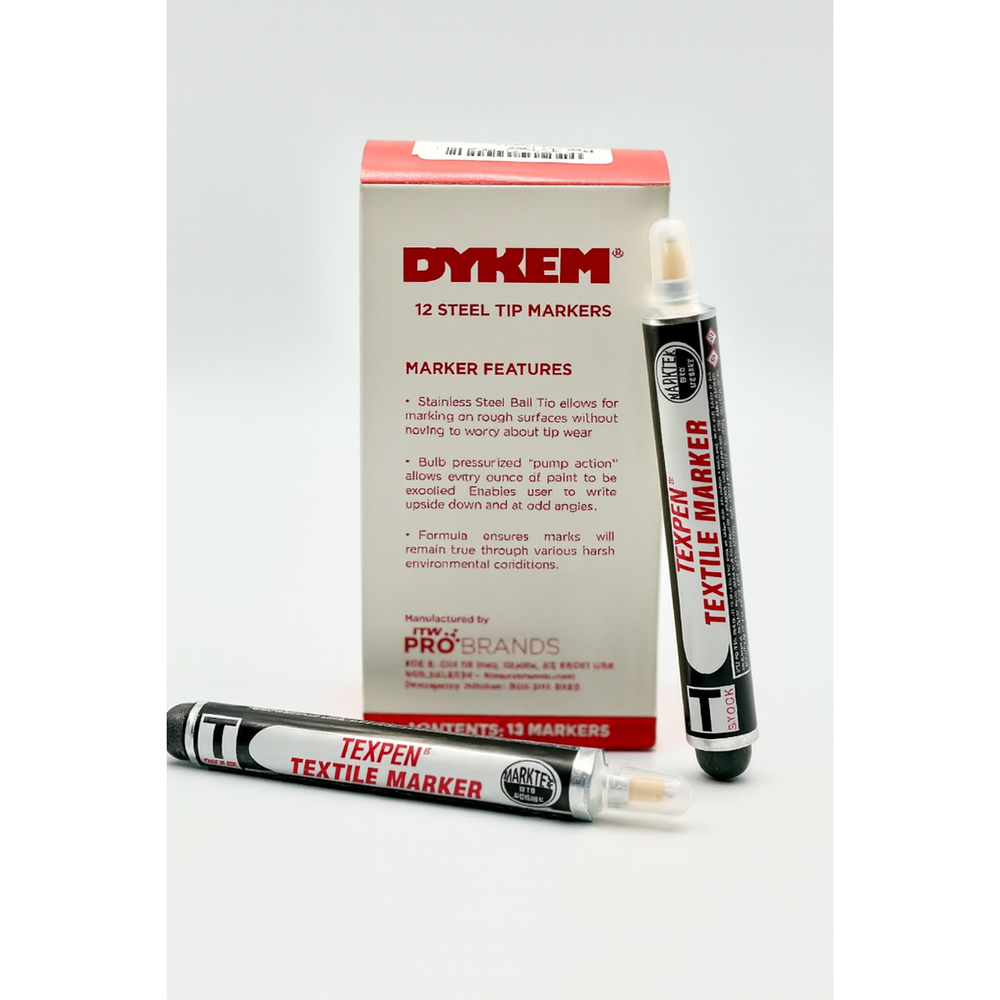Marcador Dykem TexpEn con punta de acero inoxidable y tinta de alta resistencia, ideal para textiles y superficies rugosas. Su sistema de bombeo asegura un flujo constante, incluso en posiciones inclinadas. Permite trazos precisos, duraderos y visibles en entornos industriales exigentes.