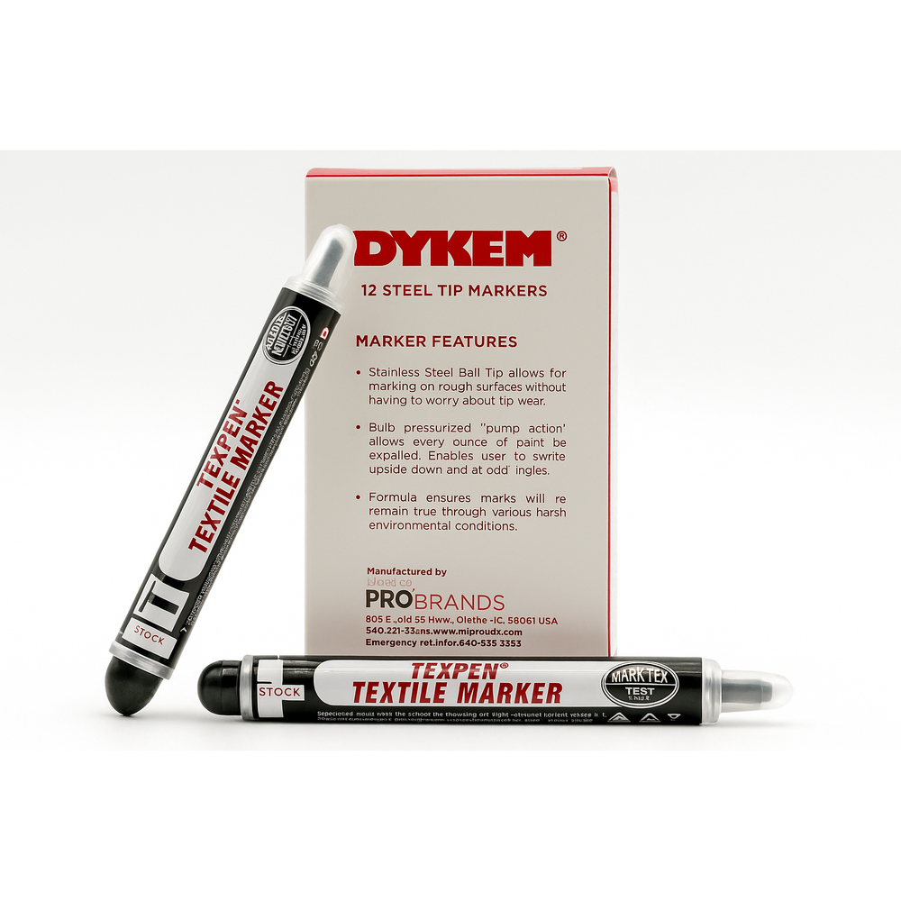 El marcador textil Dykem Texpen ofrece trazos resistentes y permanentes gracias a su punta fina y sistema de bombeo presurizado. Ideal para la industria textil y laboratorios de calidad, soporta ambientes adversos y asegura trazabilidad, precisión y durabilidad en procesos industriales.El marcador textil Dykem Texpen ofrece trazos resistentes y permanentes gracias a su punta de acero inoxidable y sistema de bombeo presurizado. Ideal para la industria textil y laboratorios de calidad, soporta ambientes adversos y asegura trazabilidad, precisión y durabilidad en procesos industriales.