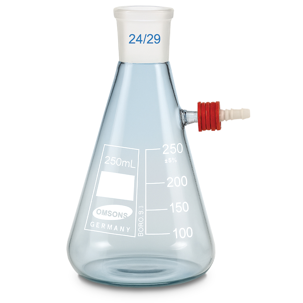 Matraz Erlenmeyer ámbar fabricado en vidrio borosilicato, diseñado para proteger muestras sensibles a luz UV. Boca estrecha para minimizar evaporación. Apto para esterilización en autoclave.
