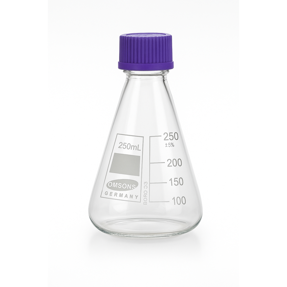 Matraz Erlenmeyer ámbar o transparente con tapón de rosca y liner interior para sellado. Perfecto para conservación de acero químicos o biológicos. Vidrio borosilicato o plástico según el modelo.
