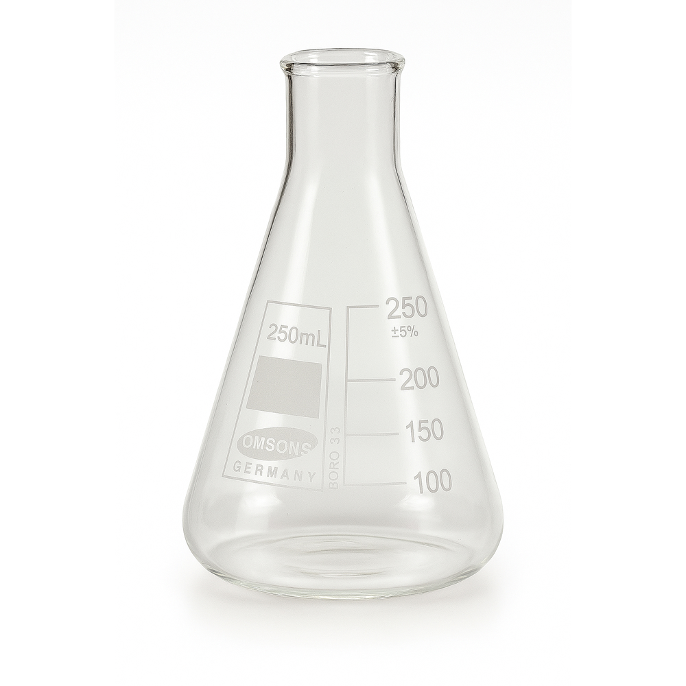 Matraz Erlenmeyer de vidrio borosilicato transparente con boca estrecha diseñada para minimizar evaporación y facilitar el vertido. Resistente térmica y químicamente. Apto para esterilización.
