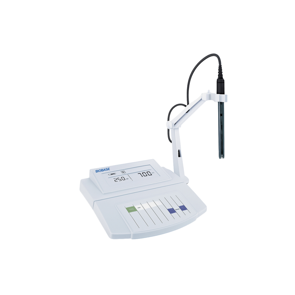Medidor de pH de mesa con pantalla digital, ideal para análisis precisos en laboratorios químicos y biológicos.