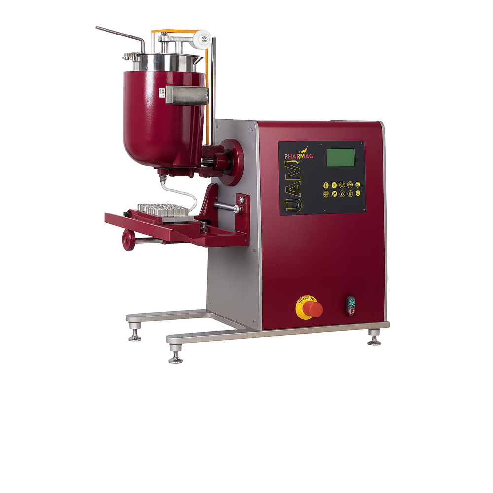 El PFM-L es un aparato diseñado para la mezcla, dosificación y moldeo de semisólidos con altos puntos de fusión, como supositorios y labiales. Consiste en un recipiente de acero inoxidable con doble camisa calefactora, un agitador y un mecanismo de dosificación. Su diseño permite la calefacción y agitación simultáneas durante la dosificación, asegurando una transferencia uniforme de calor y una producción eficiente.