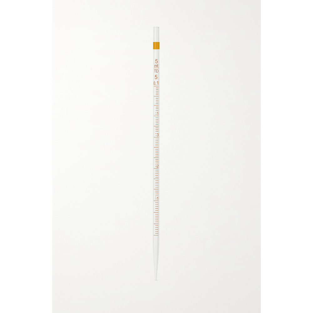 Pipeta Mohr de 5 ml, Clase B, fabricada en vidrio borosilicato transparente de alta resistencia química. Presenta graduaciones impresas resistentes al desgaste, diseñadas para la medición aproximada de volúmenes líquidos en análisis generales de laboratorio. Su diseño cilíndrico con graduaciones intermedias permite dispensar distintos volúmenes sin necesidad de llenar al máximo. Cumple con estándares internacionales para cristalería de laboratorio.
