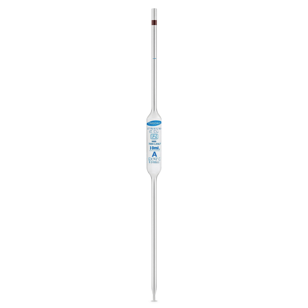 Las Pipetas Volumétricas ISI Mark One Mark Clase A están diseñadas para realizar mediciones precisas de líquidos en laboratorios analíticos y de control de calidad. Cuentan con un solo aforo, lo que permite una única medición exacta de volumen, ideal para análisis cuantitativos. Están fabricadas en vidrio borosilicato transparente, resistente a choques térmicos y químicos, y cumplen con las normas de precisión Clase A. Cada unidad lleva impresa la marca ISI, lo que garantiza conformidad con los estándares del BIS. Se suministran calibradas para entregar (TD, To Deliver).