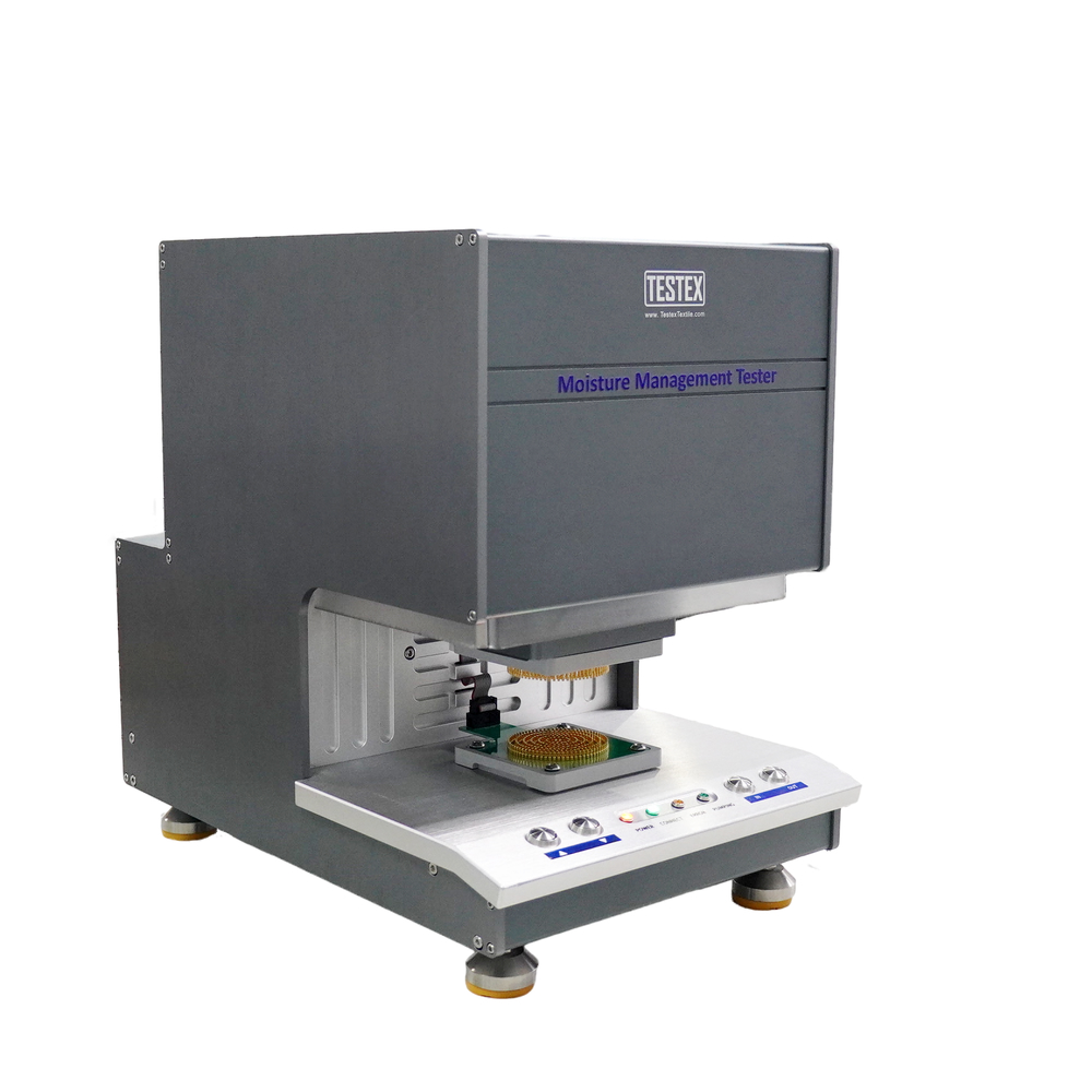 Equipo que mide la absorción y difusión de humedad en textiles, evaluando su capacidad de gestión de la humedad en prendas deportivas y funcionales.