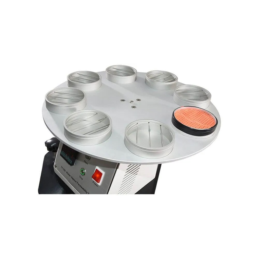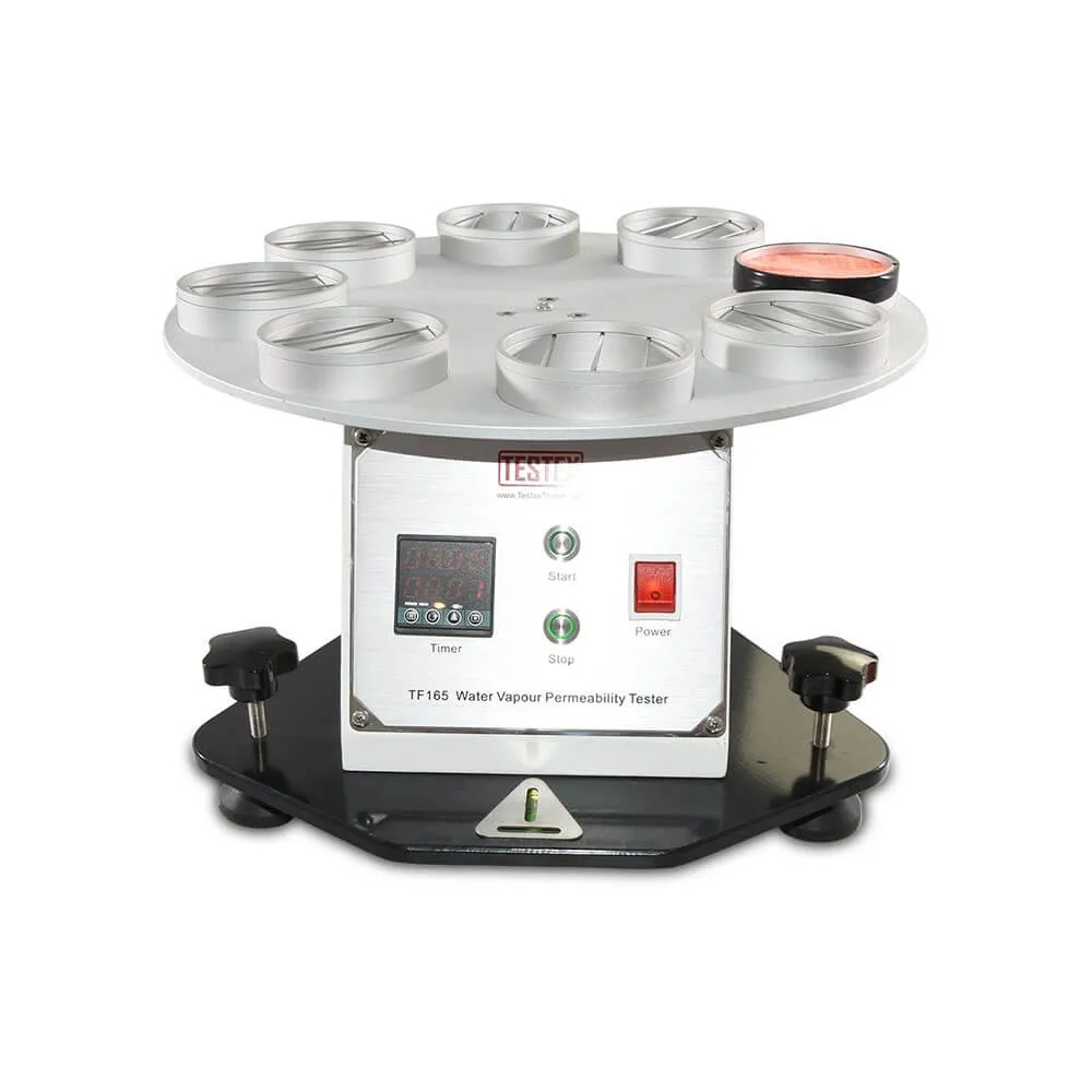 Mide la resistencia de tejidos y compuestos textiles al paso de vapor de agua. Utiliza un sistema de 8 recipientes con agua, cubiertos por una tela permeable estándar y sostenidos por anillos de sujeción. El conjunto se coloca en una cámara de condiciones controladas para calcular la tasa de transmisión de vapor. Cumple con las normas ISO 8096, BS 3424-34 y BS 7209.