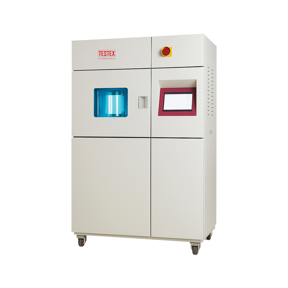 Cámara de prueba que simula condiciones climáticas para evaluar la solidez del color en materiales expuestos a luz, humedad y temperatura.