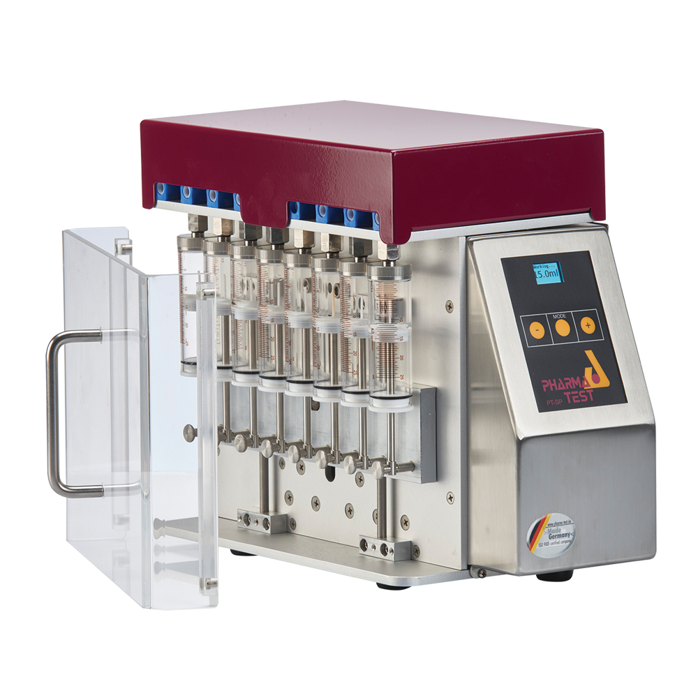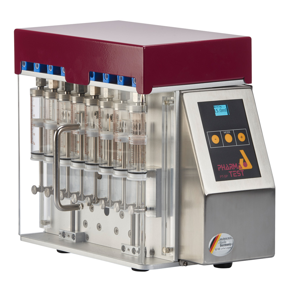 La PT-SP es una bomba multijeringa diseñada para la extracción y dosificación paralela de muestras desde un baño de disolución hacia viales en un colector de fracciones. Equipada con hasta 8 jeringas de vidrio de alta precisión de 10 ml, cada una conectada a una válvula de pinza de 3 vías para el control del flujo de medios.