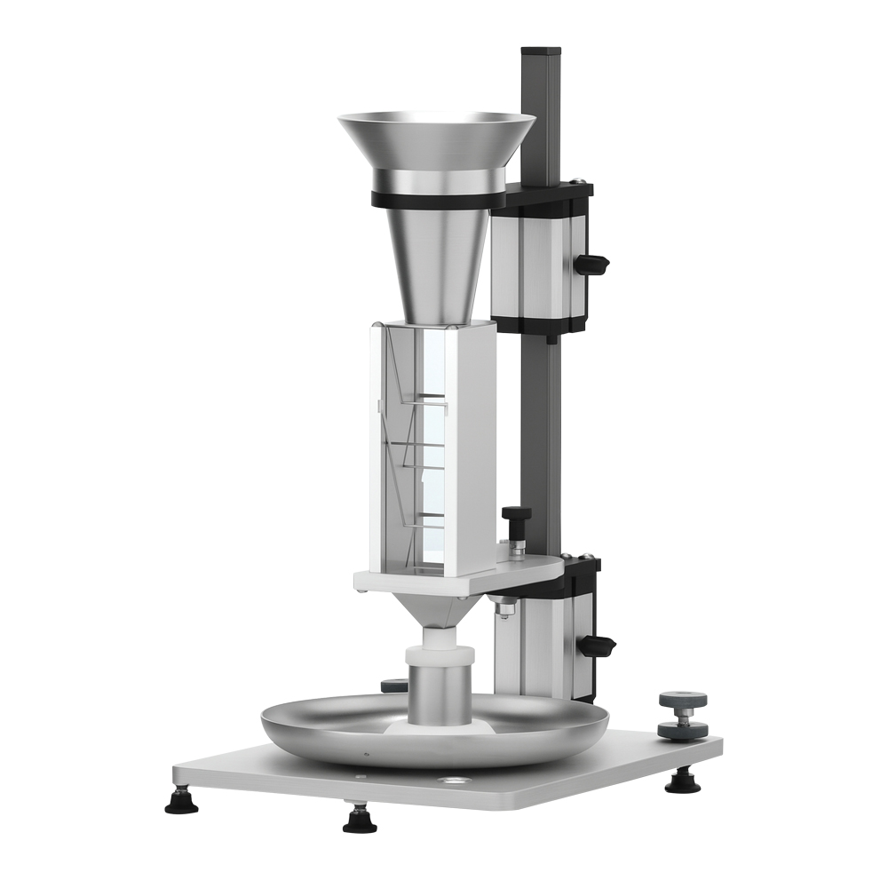 El PT-SV110 es un Volumétrico Scott diseñado para medir la densidad aparente de polvos según las monografías estándar: ISO 3923-2 (polvos metálicos), EP <2.9.34.1>, USP <616, Método II> y ASTM 32990. Funciona midiendo la masa de una cantidad de polvo que llena un recipiente de volumen conocido, logrando una condición de empaque suelto al hacer que el polvo fluya a través de una serie de deflectores de vidrio inclinados dentro de una caja de deflectores. La relación entre la masa y el volumen representa la densidad aparente.