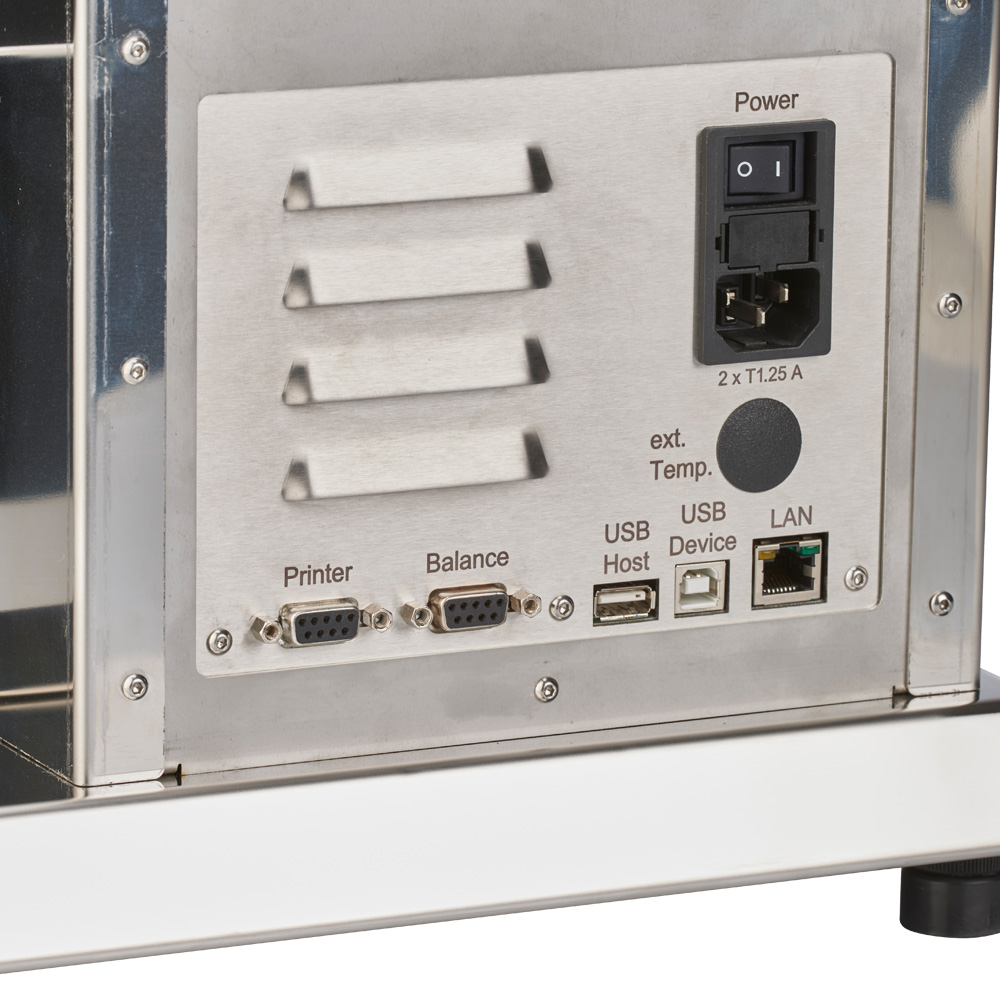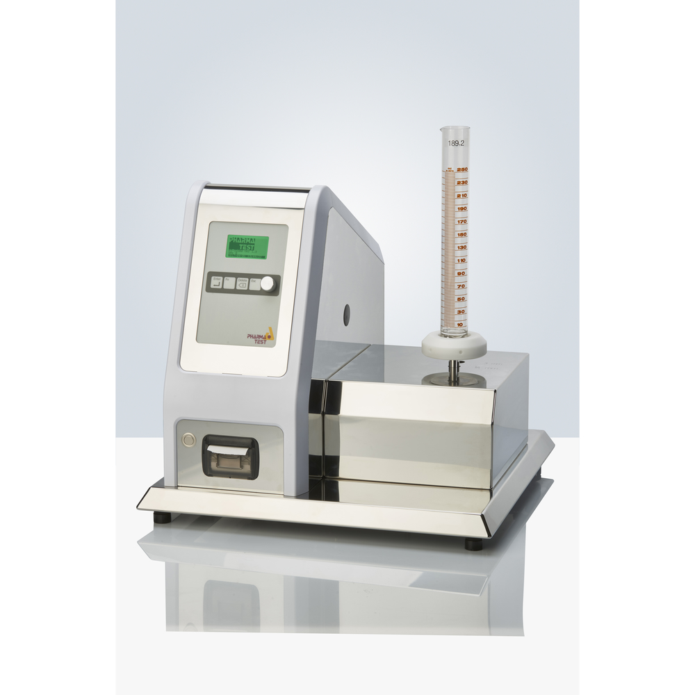 El PT-TD300 es un instrumento diseñado para evaluar la densidad aparente y la densidad golpeada de polvos, gránulos y pigmentos. Cumple con las normas USP <616> métodos 1 y 2, EP <2.9.34>, DIN EN ISO 787-11, ASTM B527 y ASTM D7481.18. El dispositivo calcula automáticamente la densidad golpeada, la relación de fluidez de Hausner y el índice de compresibilidad de Carr después de cada prueba, documentando los resultados mediante la impresora integrada.