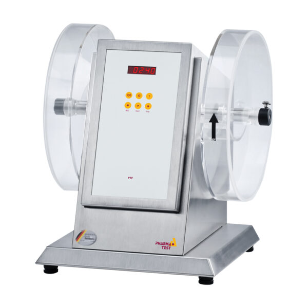 Instrumentos de prueba de friabilidad de tabletas con doble tambor y velocidad fija (PTF 20E) o variable (PTF 20ER), diseñados para evaluar la resistencia mecánica de las tabletas durante procesos como recubrimiento, transporte y empaque.