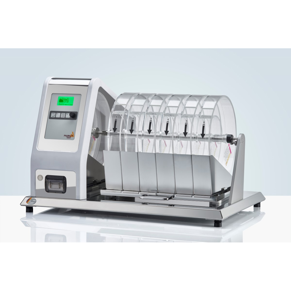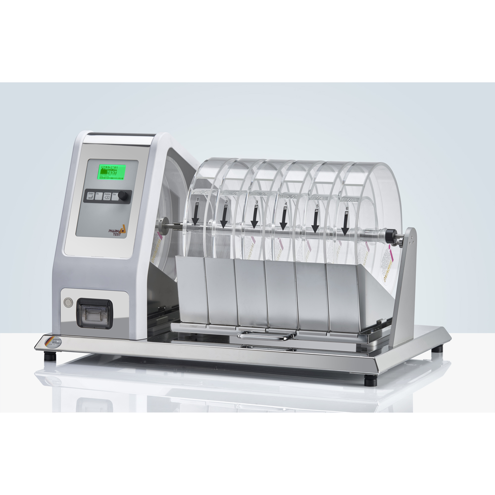 El PTF 600 es un equipo diseñado para evaluar la friabilidad y abrasión de tabletas utilizando seis tambores de prueba. Cumple con las farmacopeas USP <1216>, EP <2.9.7> y JP <14>. El dispositivo permite programar el número de revoluciones o el tiempo de rotación, y cuenta con una función de descarga automática de muestras al finalizar la prueba. Además, ofrece la posibilidad de conectar una balanza analítica para determinar el peso de las muestras antes y después de la prueba, facilitando el cálculo automático de la pérdida de peso.
