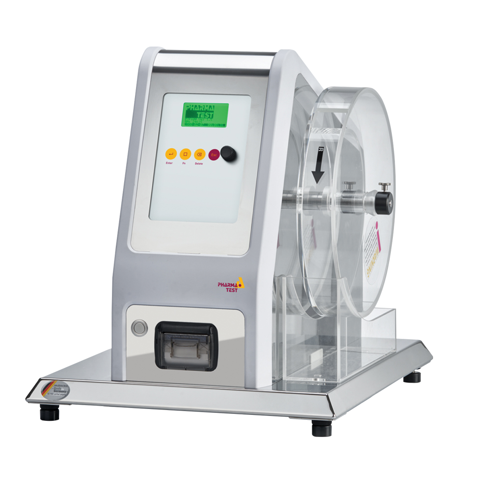 Instrumento de prueba de friabilidad y abrasión de tabletas de un solo tambor, conforme a las farmacopeas USP <1216>, EP <2.9.7> y JP <14>, con descarga automática de muestras y opción de conexión a balanza analítica.