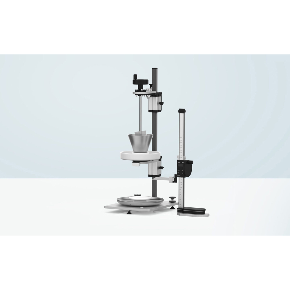El PTG-M100 es un probador manual diseñado para medir el comportamiento de flujo de gránulos y polvos, cumpliendo con las normas EP <2.9.36>, EP <2.9.16>, USP <1174> e ISO 4324. Este instrumento determina el tiempo de flujo del polvo y su ángulo de reposo. Al utilizar una balanza de laboratorio, también es posible calcular el peso, la densidad y el volumen del cono de polvo. Además, permite medir el tiempo que tarda una muestra de 100 g en fluir a través de una boquilla específica, según el método de flujo a través de un orificio con embudo.