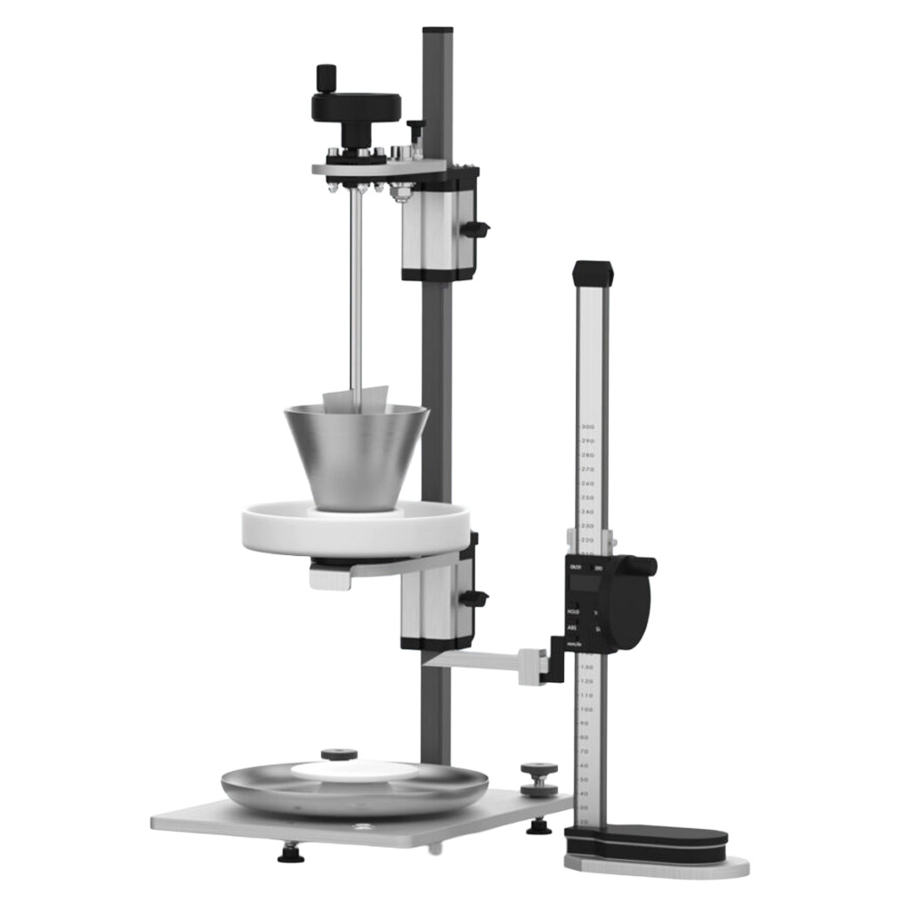 Instrumento manual para medir la fluidez de polvos y gránulos, así como el ángulo de reposo, proporcionando datos esenciales para evaluar las propiedades de flujo de materiales en polvo.