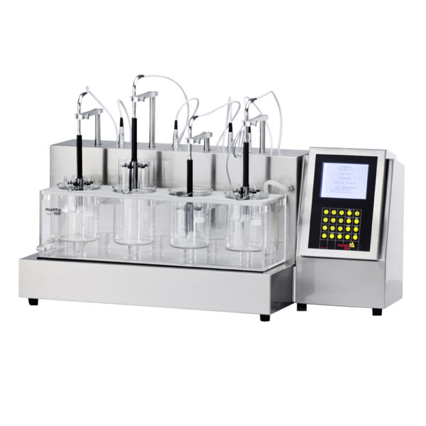 Instrumento semiautomatizado para pruebas de desintegración de tabletas, disponible en configuraciones de una a cuatro estaciones, con operación independiente y cumplimiento de farmacopeas USP y EP.