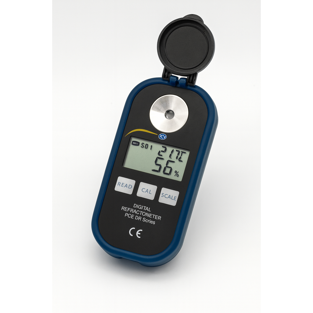 Colocar 4–5 gotas de muestra en el prisma, cerrar la tapa y leer el resultado en la pantalla LCD. Calibrar con agua destilada antes del uso.
