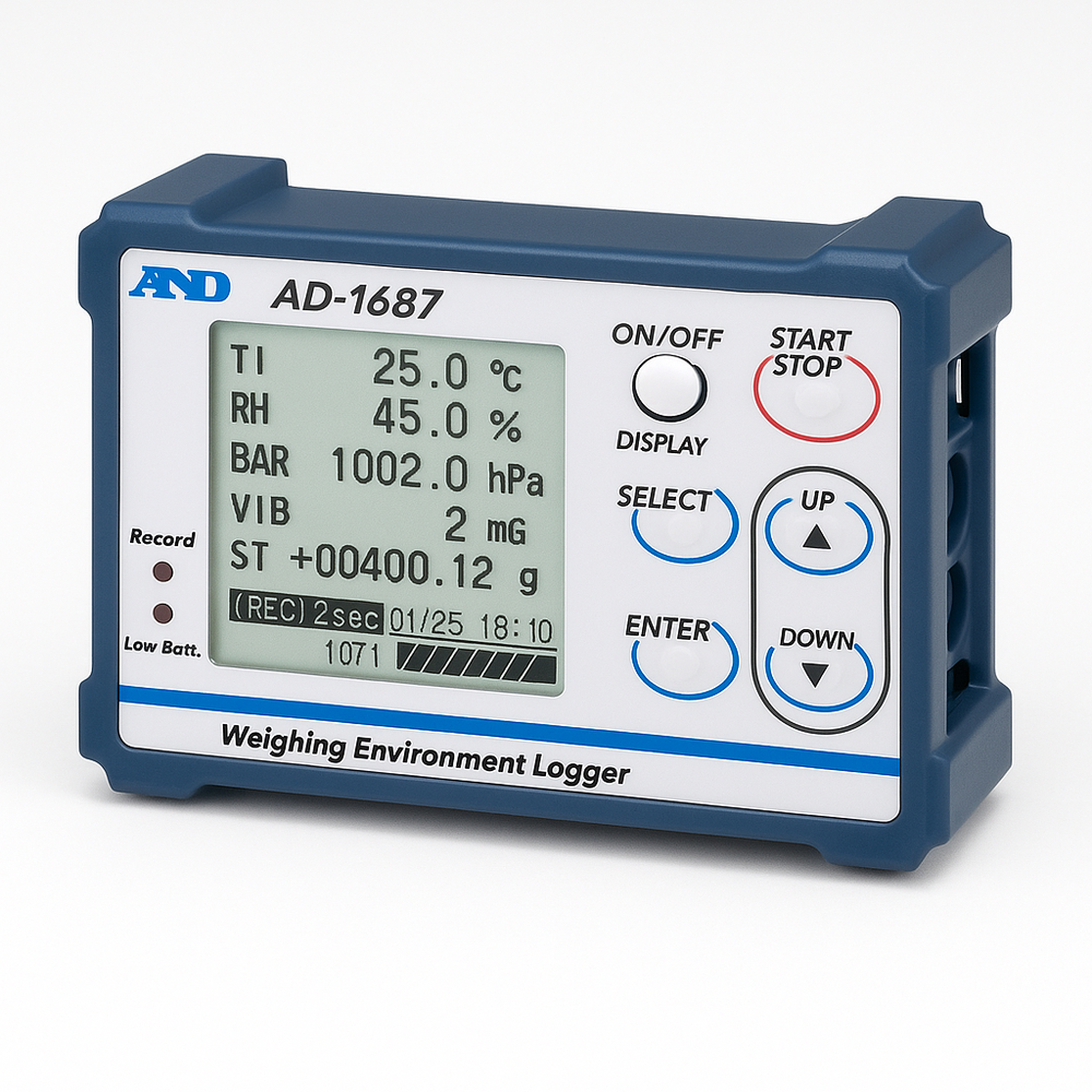 Dispositivo portátil que mide y registra simultáneamente flujo de aire, temperatura, humedad, presión barométrica y vibración, ideal para monitorear condiciones ambientales en procesos de pesaje.