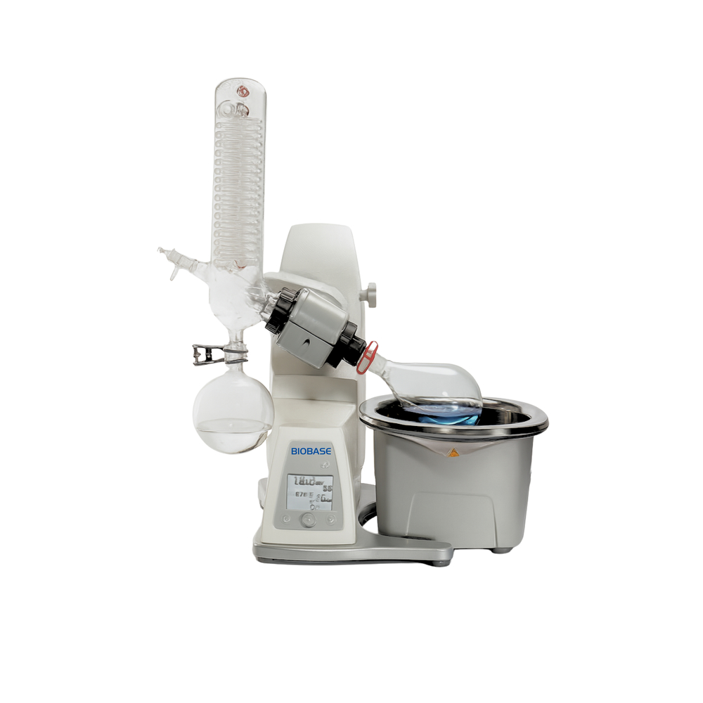 Evaporador rotatorio 1 L, motor DC sin escobillas, baño dual agua/aceite 5 L hasta 180 °C, panel LCD, giro reversible 20–280 rpm, elevación automática y control USB digital.