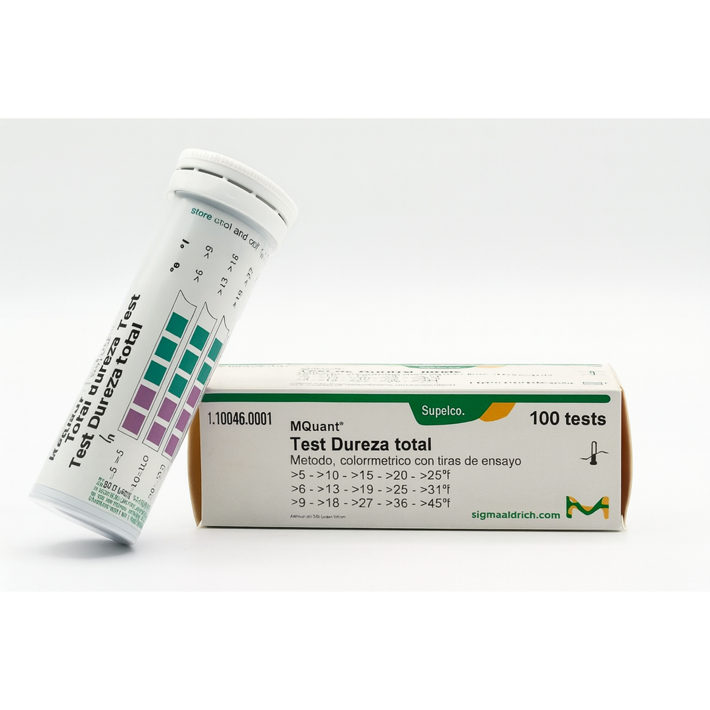 El test Merck de dureza total utiliza tiras reactivas colorimétricas para medir concentraciones de iones en agua. Permite una lectura rápida y precisa de valores de dureza en ppm, útil en control de calidad, laboratorios ambientales e industriales. Presentación en caja con 100 pruebas listas para uso.