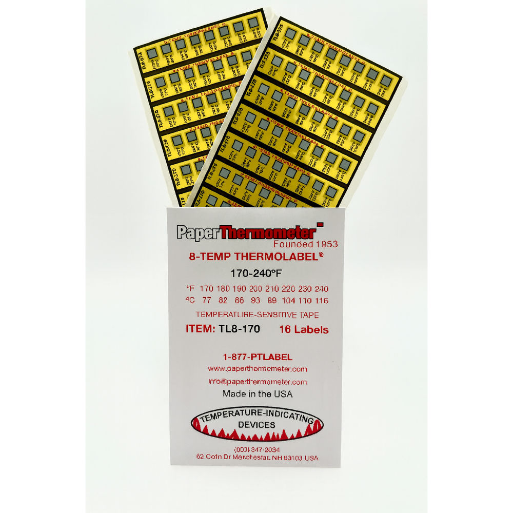 Etiquetas Thermolabel adhesivas con 8 indicadores irreversibles de temperatura entre 210 °C y 280 °C. Ideales para procesos de esterilización, hornos, equipos de laboratorio e industria, asegurando seguridad y precisión.