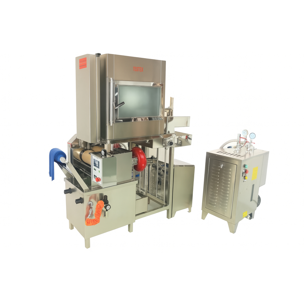 El Lab Pad Steam Range TD630 de TESTEX es un equipo de laboratorio que combina un exprimidor (padder) y una cámara de vapor (steamer) para realizar procesos de pad-steam con vapor saturado. Diseñado para ofrecer la distancia más corta (100 mm) entre el padder y la cámara de vapor, minimizando perturbaciones y mejorando la estabilidad y repetibilidad en la fijación de colorantes, especialmente azufrados y vat dyes. El sistema incluye un padder horizontal con rodillos de NBR y una cámara de vapor con capacidad para 6 m de tejido, temperatura ajustable entre 98–100 °C y tiempo de permanencia de 20–120 s.